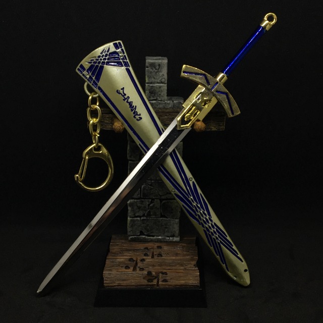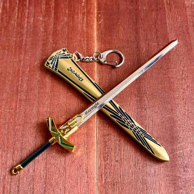 騎士王の英霊が持つ宝具。 人々の「こうであって欲しい」という想念が 星の内部で結晶・精製された神造兵装であり、 「最強の幻想《ラスト・ファンタズム》」 とも呼ばれる。 聖剣というカテゴリーの中において 頂点に立つ最強の聖剣。 元々は星の触覚である精霊「湖の乙女」の手で 管理されていたが、一時的にアーサー王に 委ねられた。 単純に外観の美しさでいえば上回る宝具は いくらでもあるが、 そもそも美しいのではなくて 只管に尊く、神話にも人ならざる業にもよらず、 ただ思いだけで鍛え上げられた結晶であるが故に 空想の身でありながら最強の座に在る。 約束された勝利の剣《エクスカリバー》 種別:対城宝具 『束ねるは星の息吹、輝ける命の奔流』 宝具「全て遠き理想郷《アヴァロン》」 種別:結界宝具 持ち主に不老不死と無限の治癒能力をもたらす、 宝具「約束された勝利の剣(エクスカリバー)」 の鞘。 Material: Alloy Sword Size: 17cm Scabbard Length: 13cm