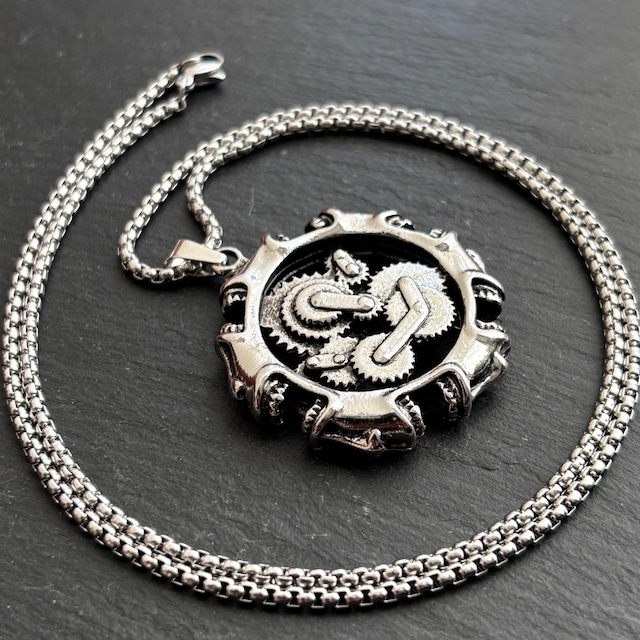其れは、死の瞬間に放たれる叫びを歯車へと封じた、禁断の魔導装置。断末魔は力へと変換され、重なり合うギアは終わりなき怨嗟を刻み続ける。 外殻の怨念に満ちた連なる顔は、阿鼻叫喚の呻(うめ)き声をあげ、新たなる魔導エネルギーを生み出す。 其れは呪いを背負う覚悟を持つ者のみが触れる事ができる、闇の遺物である。 material : stainless steel size : 3.8×3.8cm necklace : 58cm
