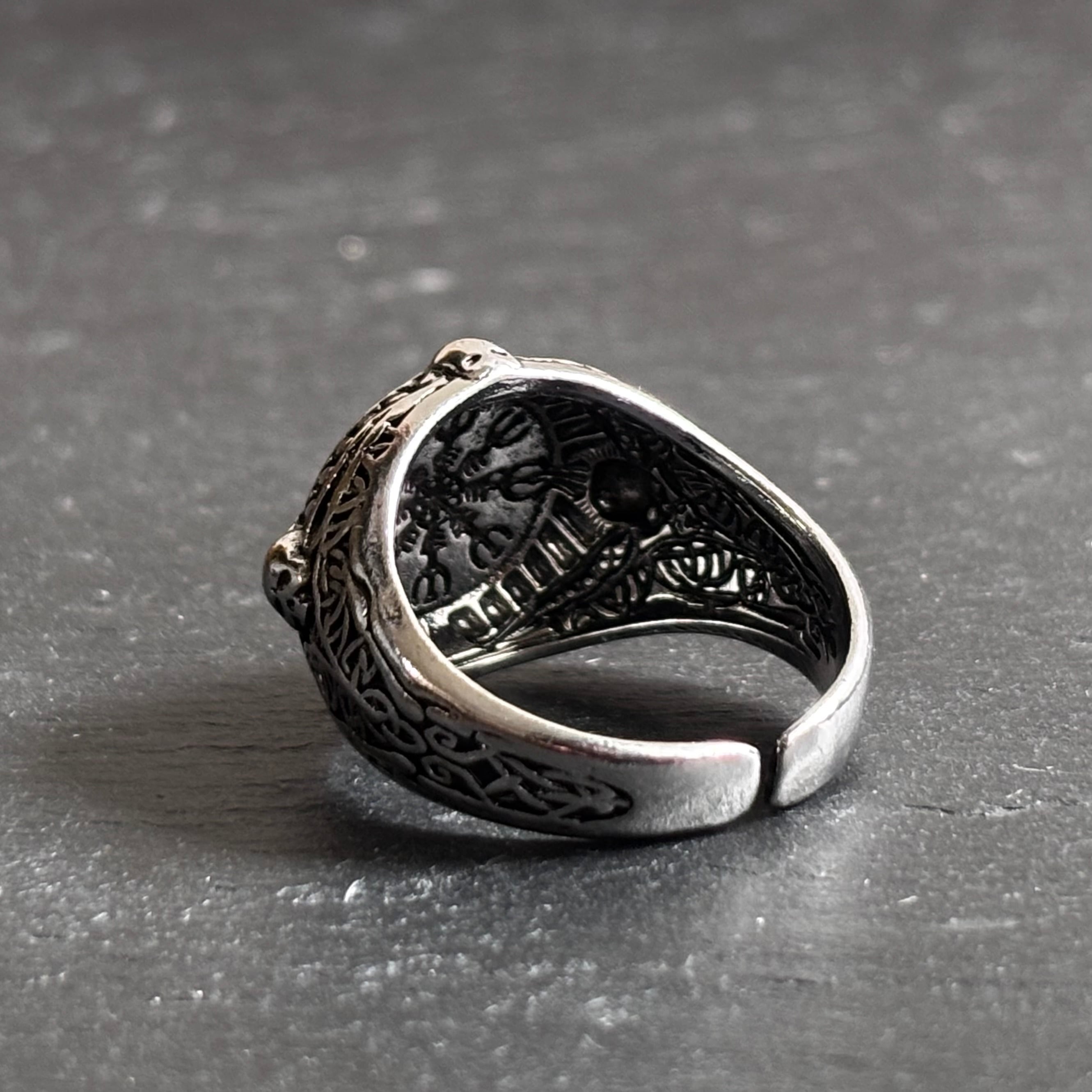 「畏怖の兜」のシンボルが刻まれた指輪。古の竜が用いた力と同じく、持ち主を守護し、周囲に畏怖をもたらすと信じられてきた。魔除けや戦勝祈願の護符としても用いられる強力な魔術印である。