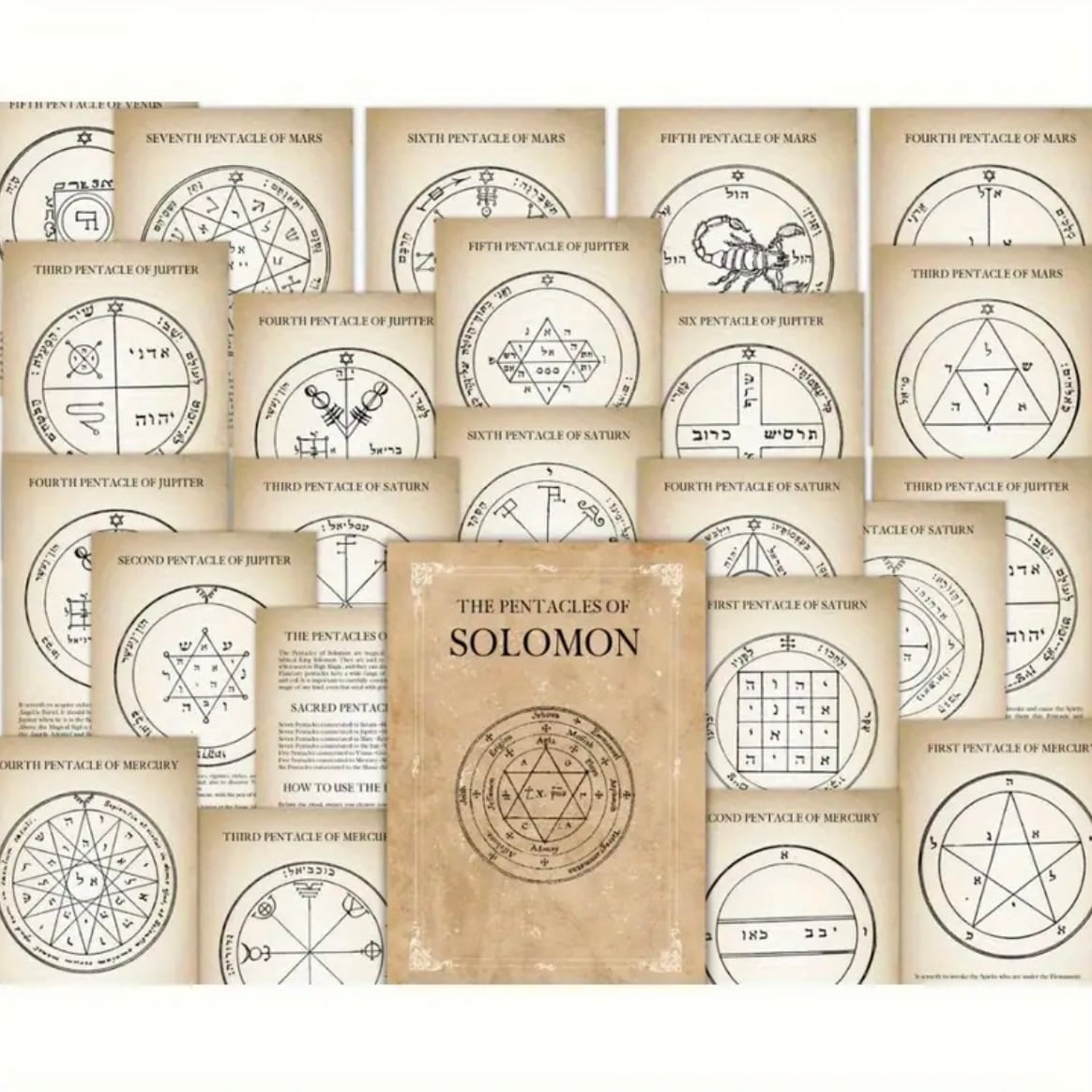 七惑星に対応する全てのペンタクルが収録され、各章には「浄化」「召喚」「供物」「金属対応」「注意事項」など、古の魔術師たちの知恵が封じられている。