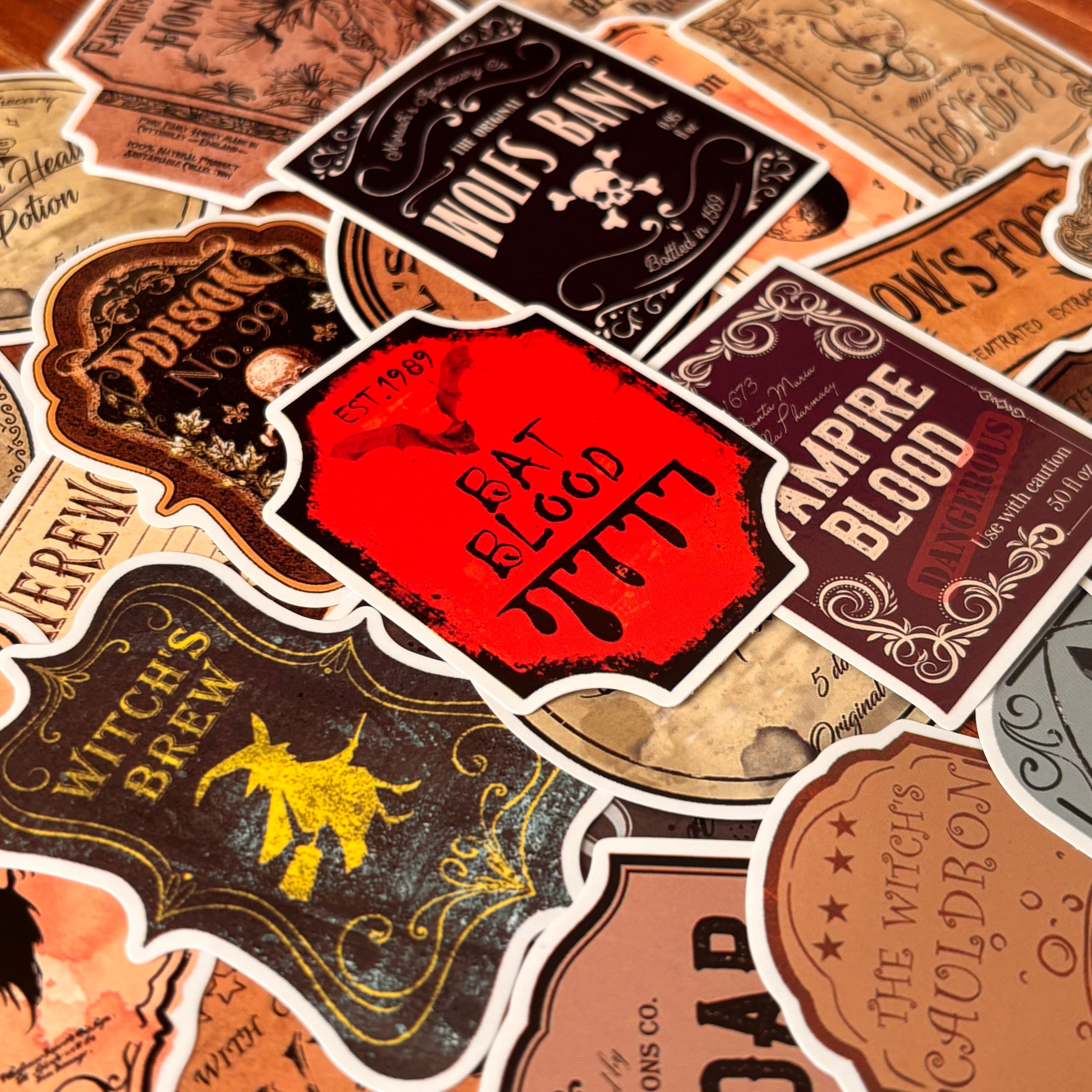 毒薬・吸血鬼の血・幽鬼の精髄など、闇の儀式や夜の調合を思わせる黒魔術系のラベル群。