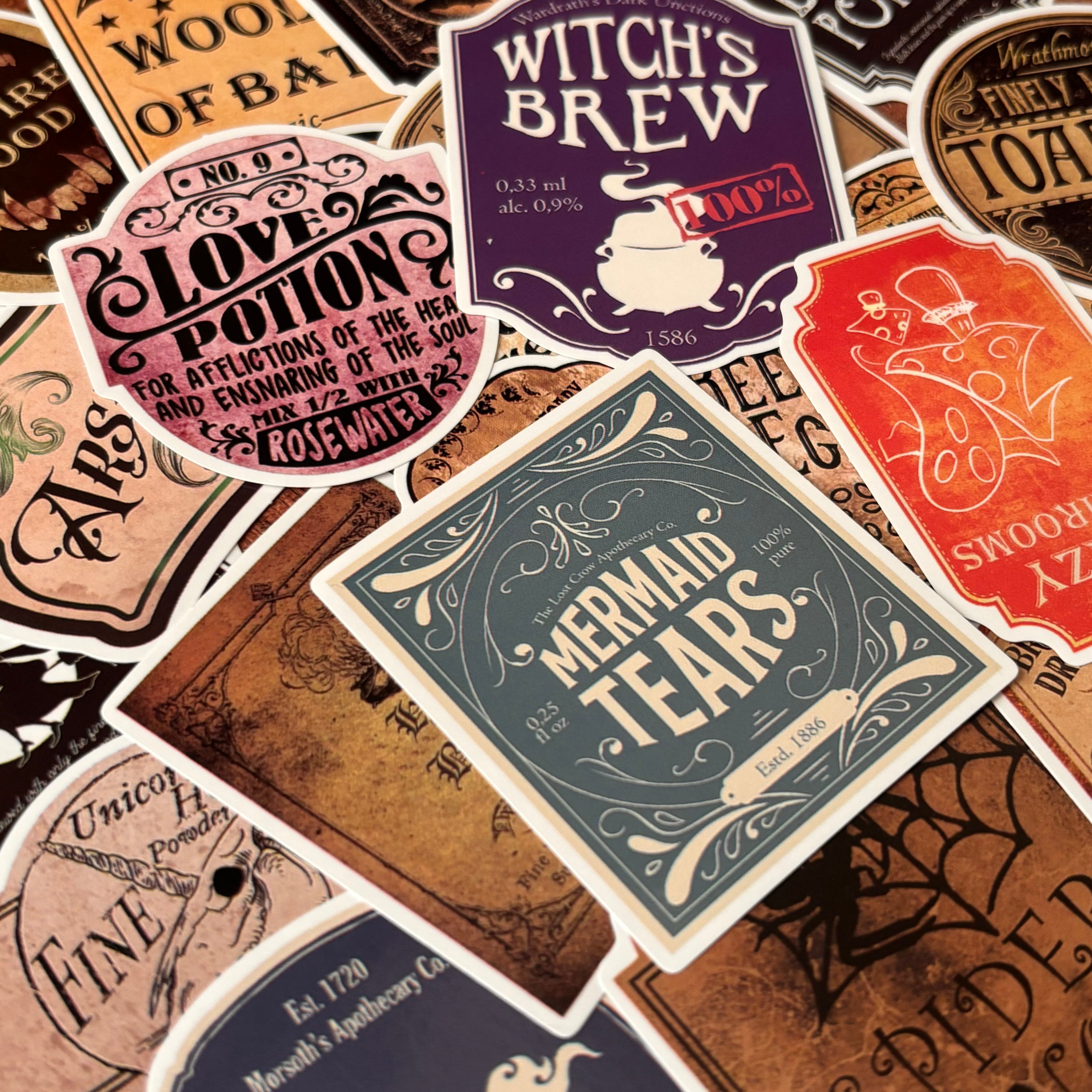 それぞれのラベルには、幻想世界の薬草・素材・呪薬の名が記されており、貼るだけで棚が魔法工房のような雰囲気に。