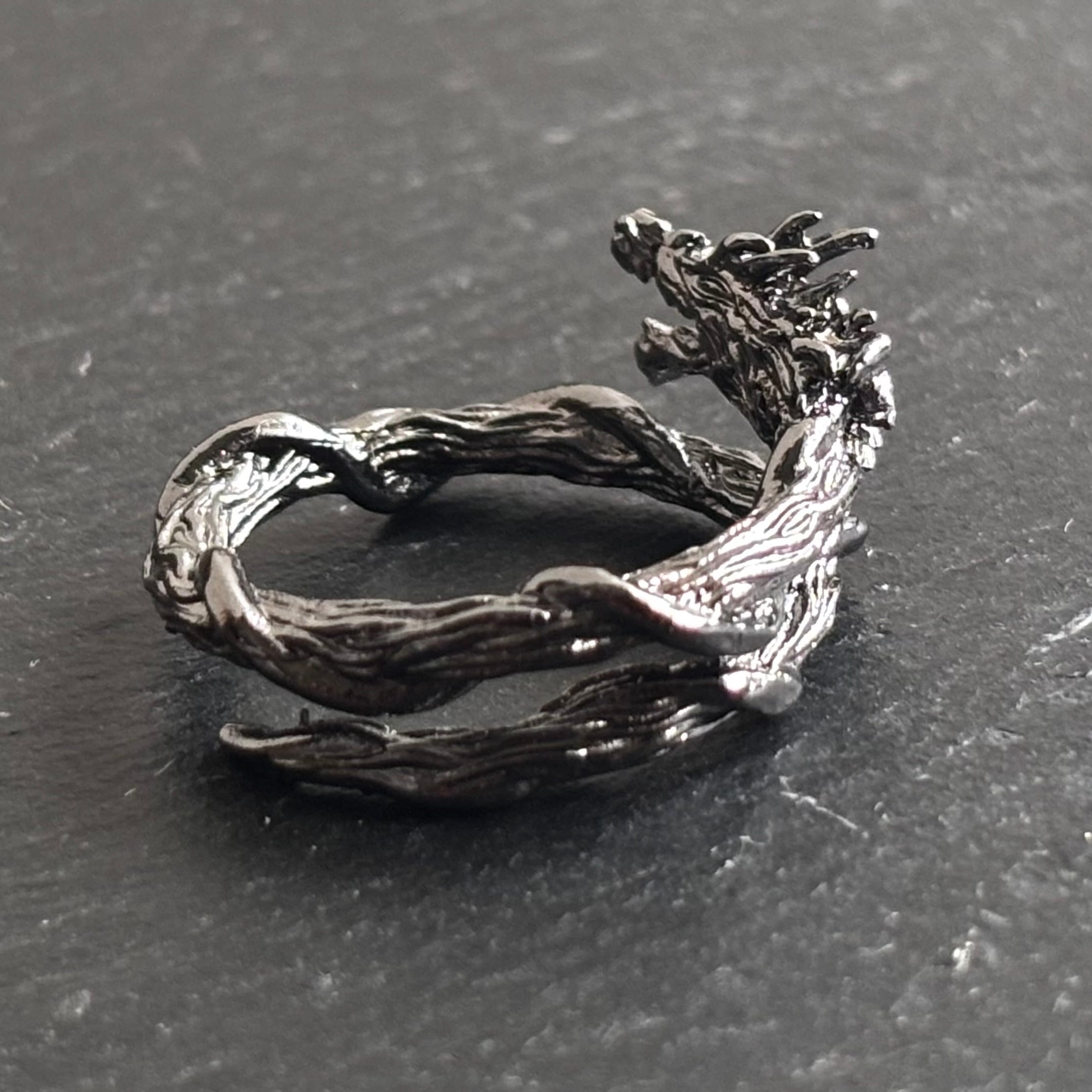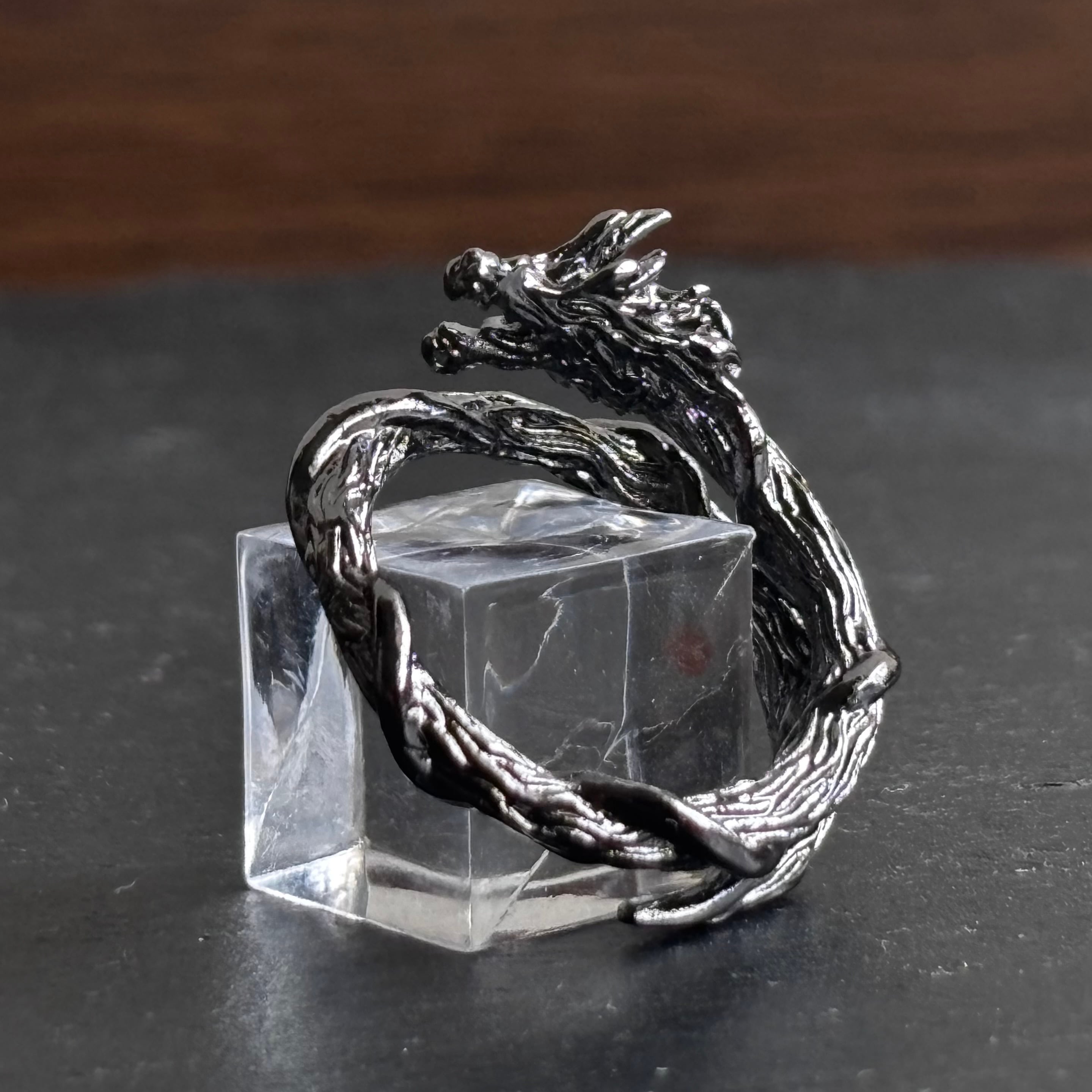 形状:龍が指に巻き付くような意匠に漆黒の艶が特徴の指輪