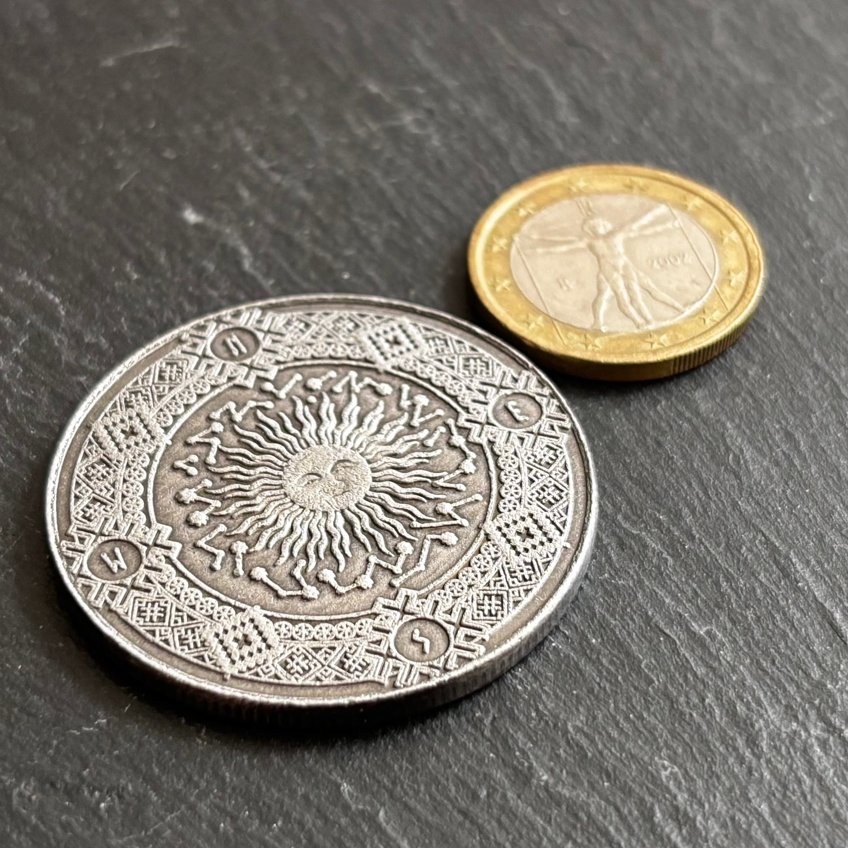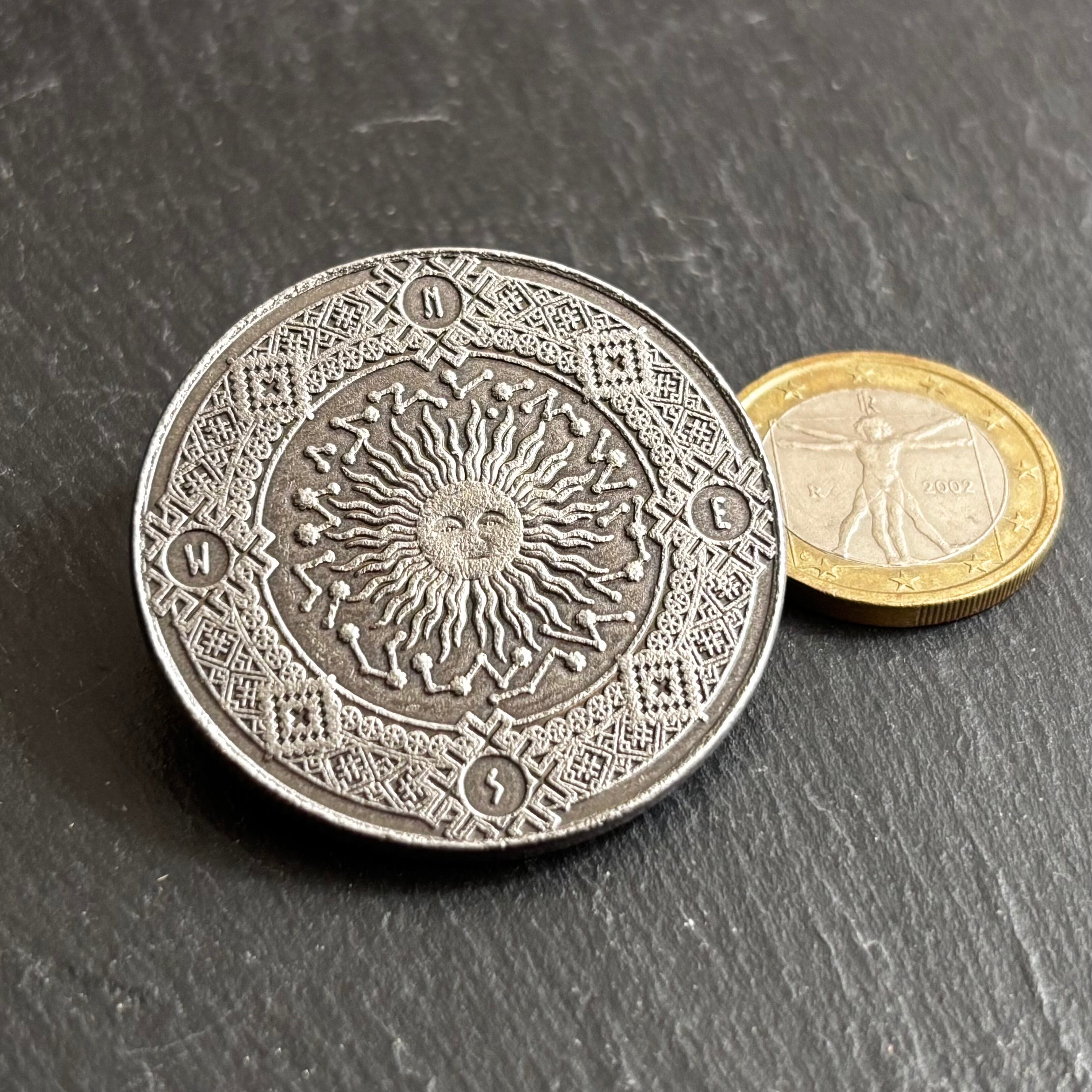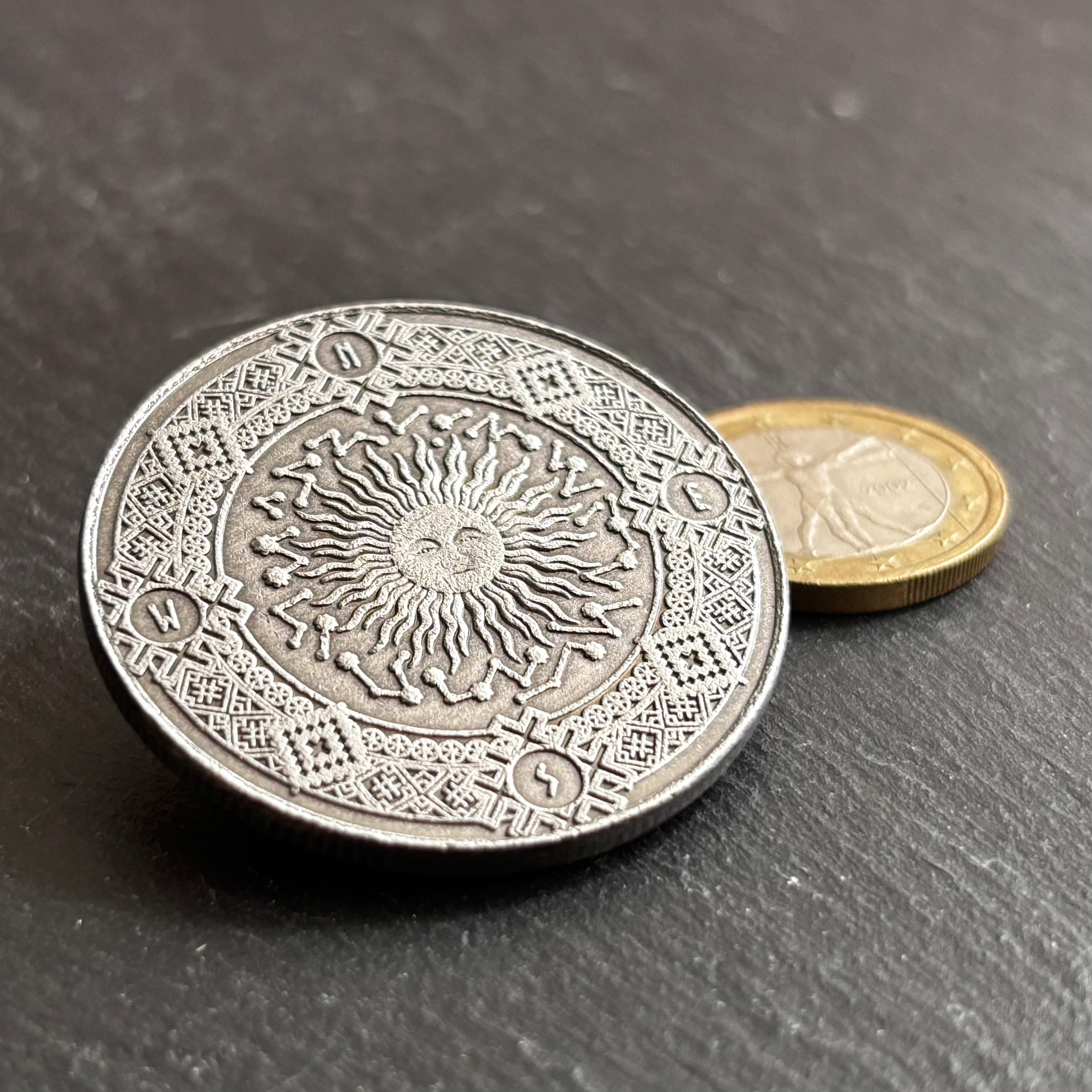 このメダルには、宇宙の秩序と循環が凝縮されており、自らの星の導きを思い出すタリスマン(護符)として、あるいは日々の暮らしに星々のリズムを呼び込みたい方へ、星の言葉を宿す一枚である。