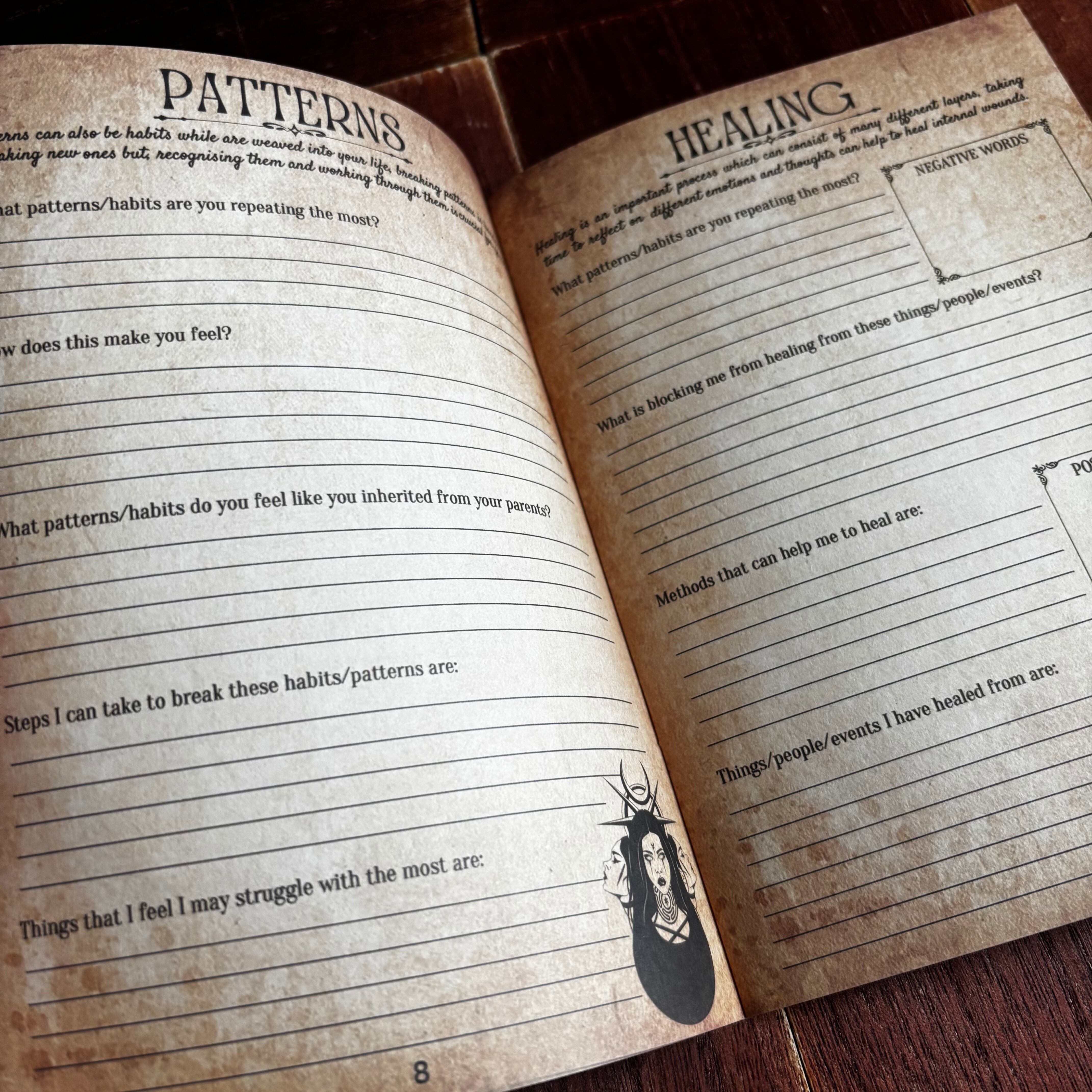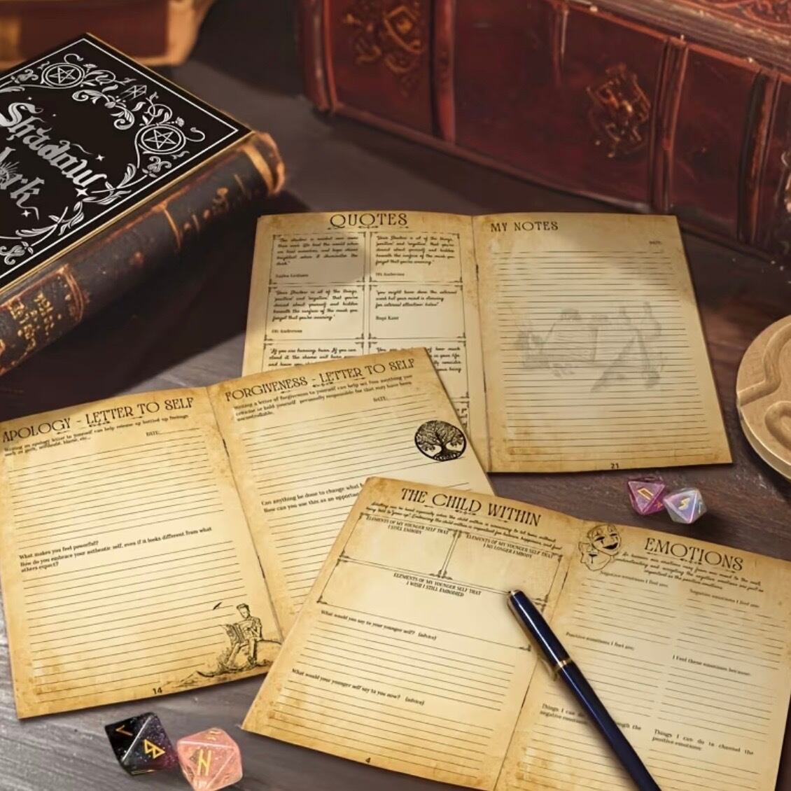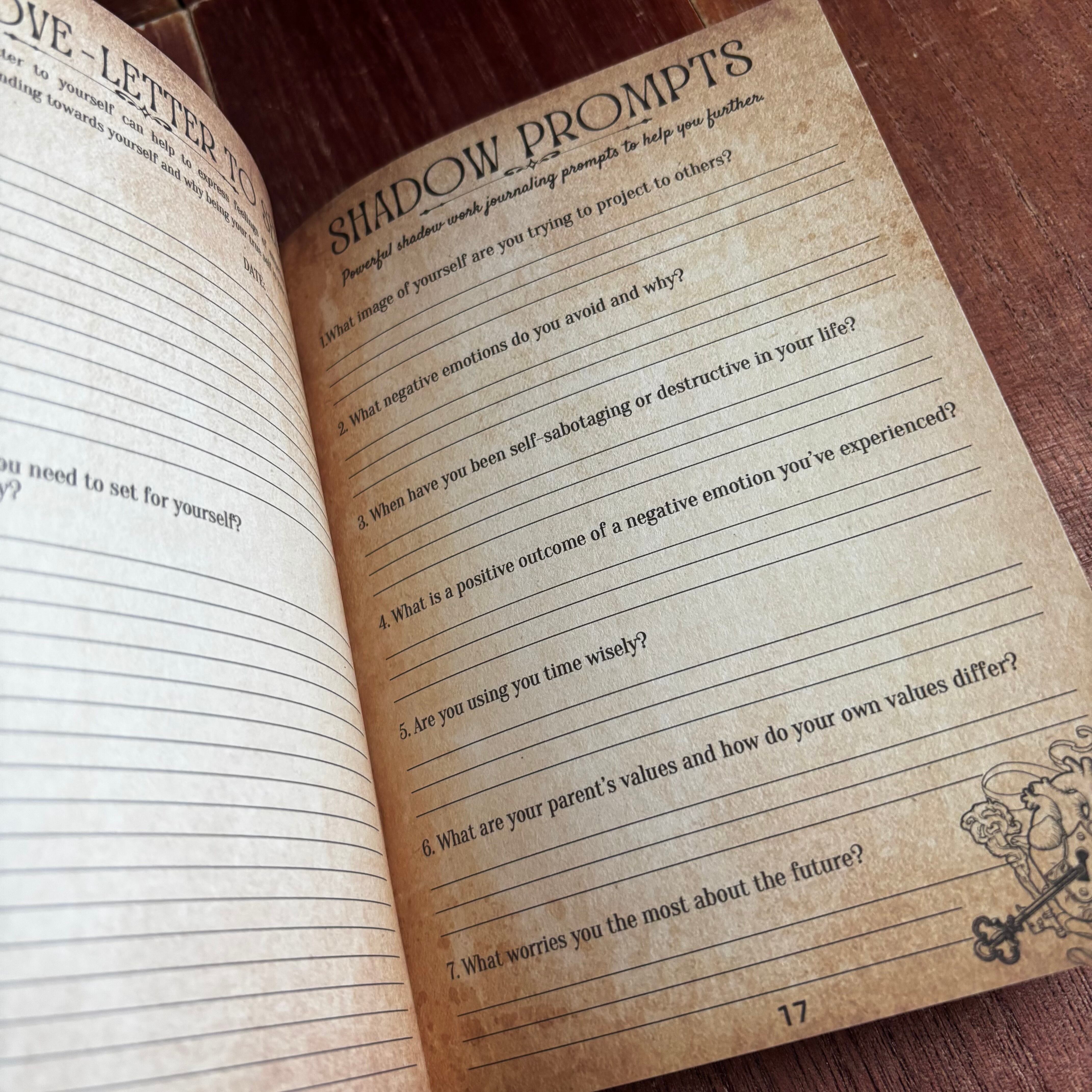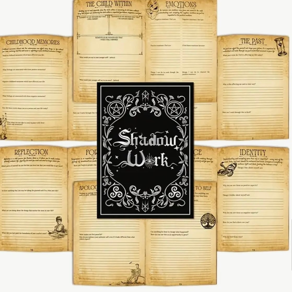 過去、感情、トリガー、内なる子ども、癒し、許しなど、シャドウワークに必要なテーマ別ページを収録。