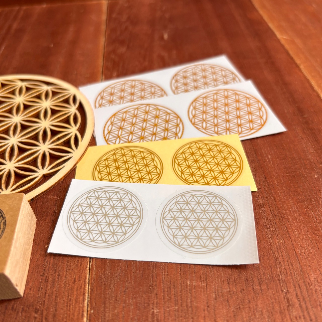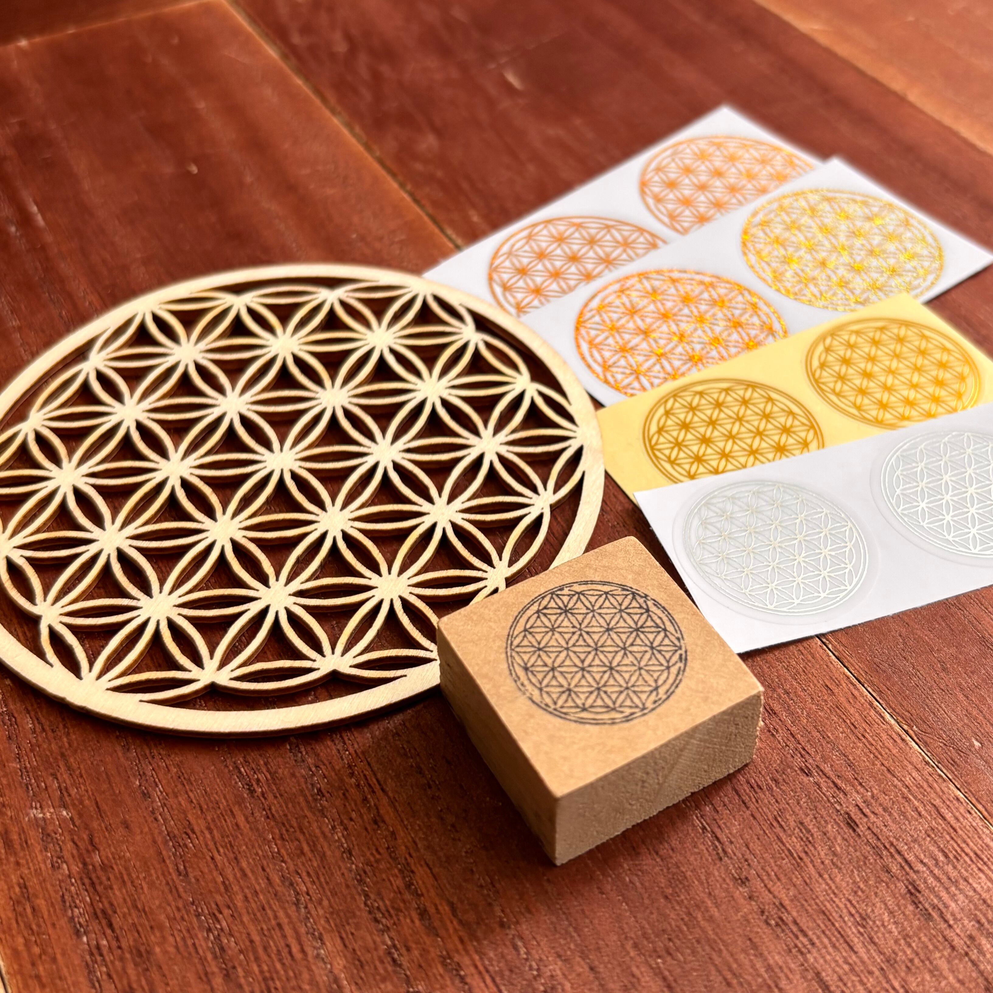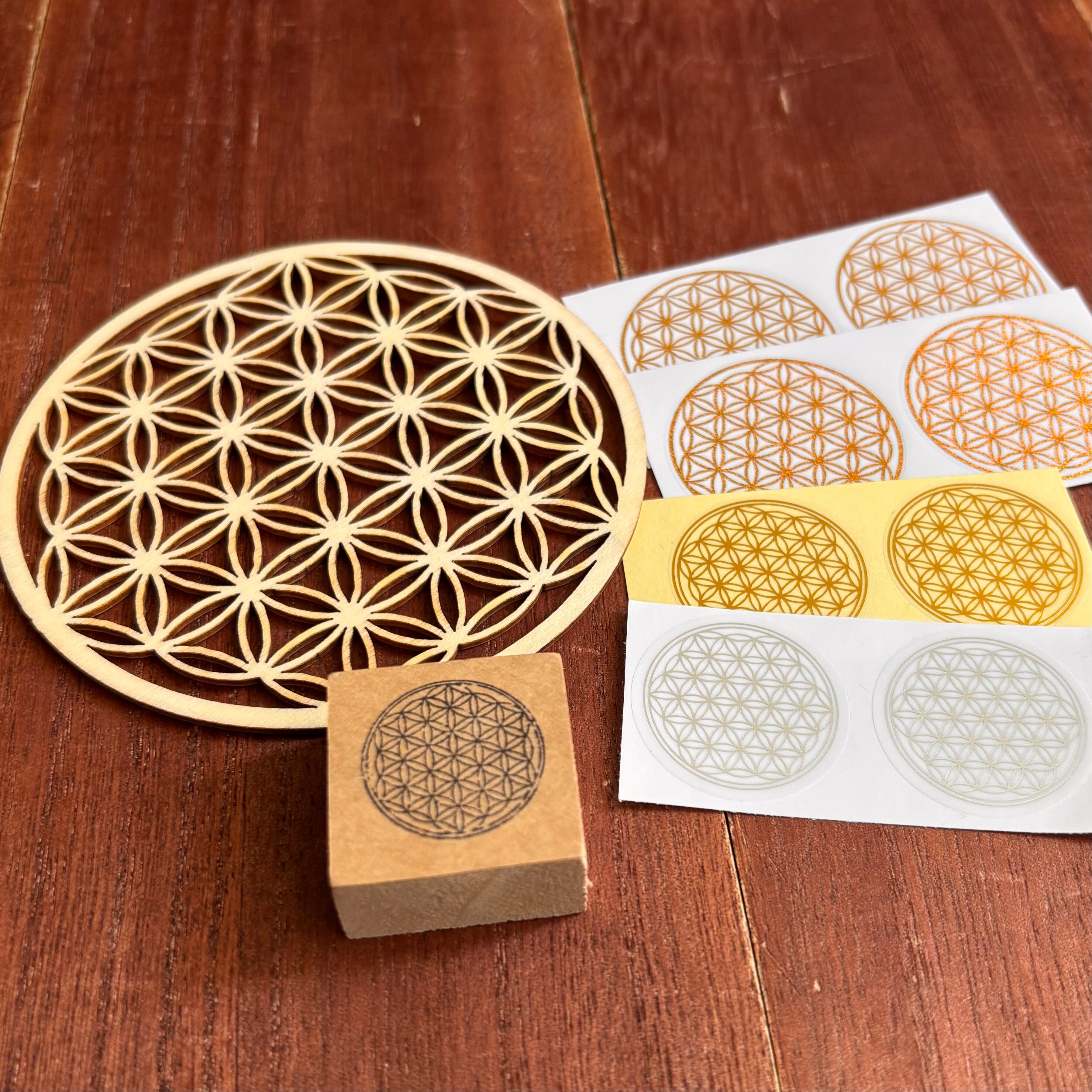 神聖幾何学の象徴「フラワー・オブ・ライフ」を中心に、スタンプ、木製コースター、ステッカーを集めたアートセット。神秘的な図形が空間と心に静かな調和をもたらします。