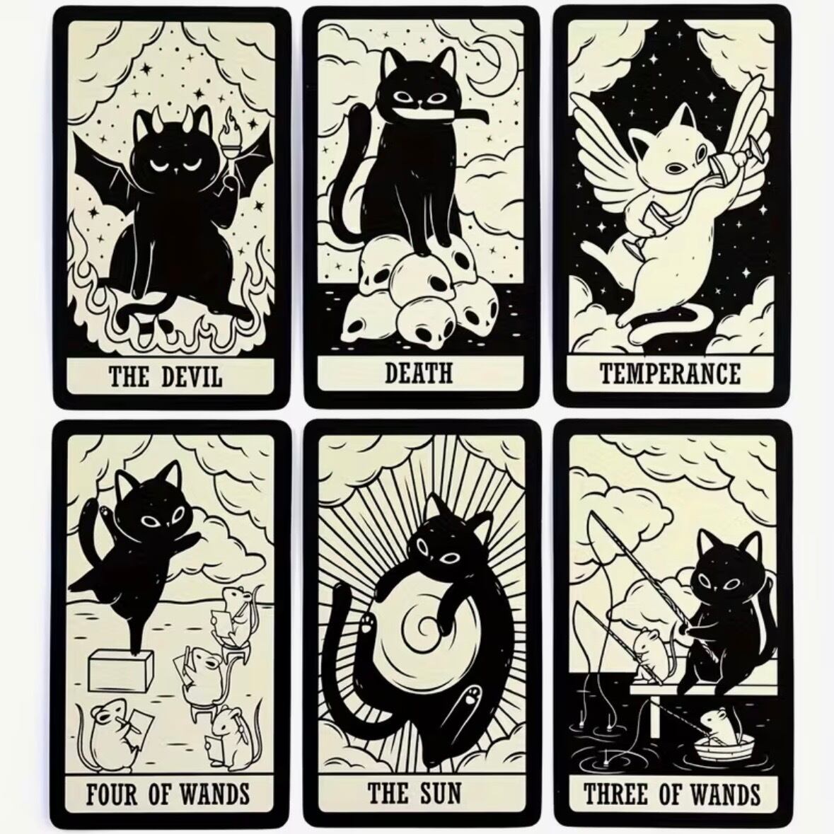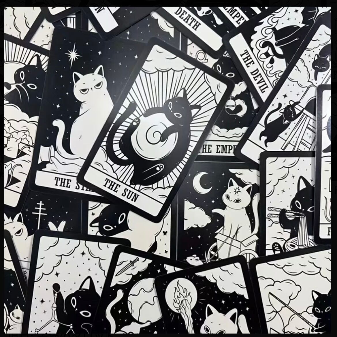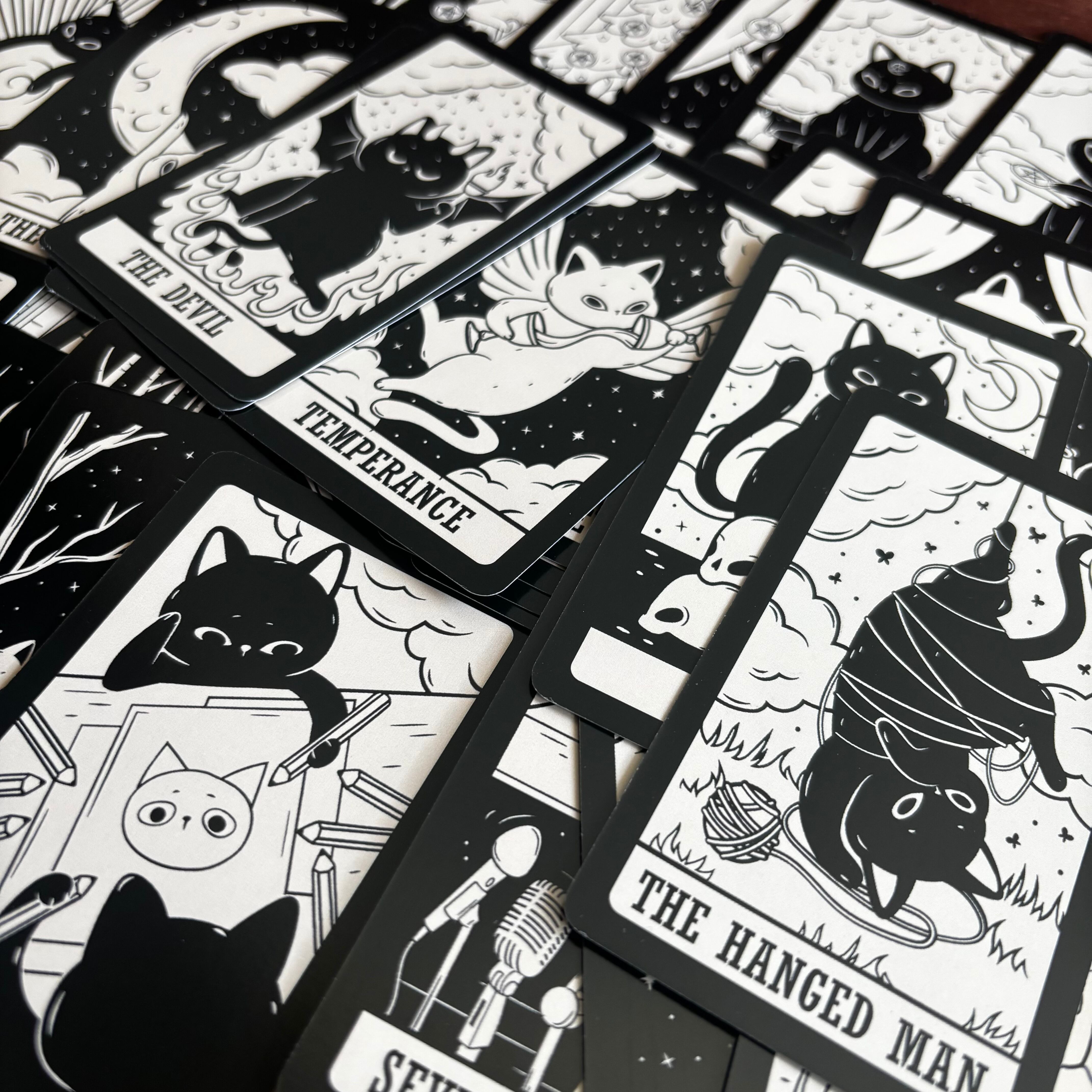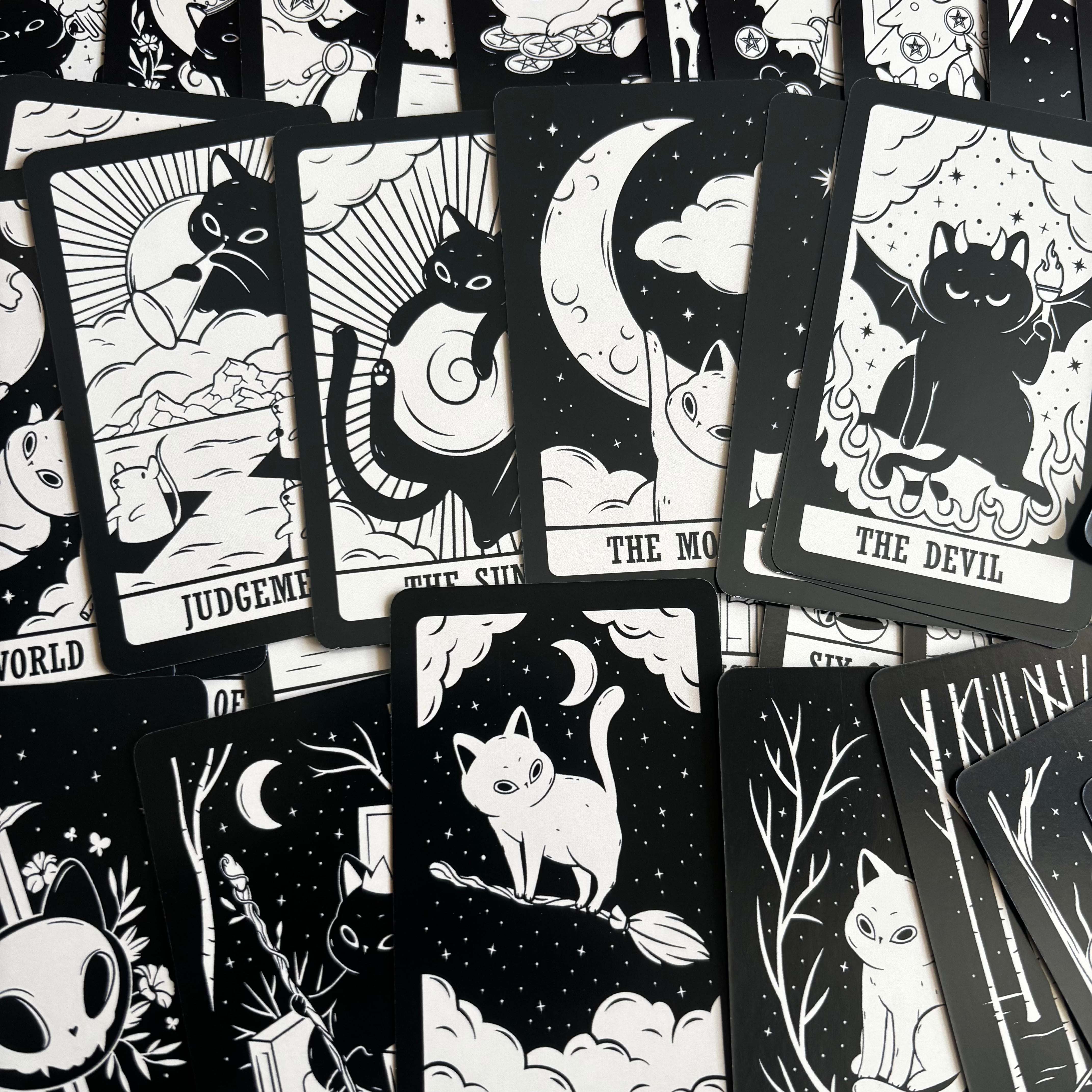 78枚のフルデッキで構成され、大アルカナから小アルカナまで、伝統的な意味をベースにしながらも、猫ならではの自由で気まぐれなエネルギーが加えられている。
