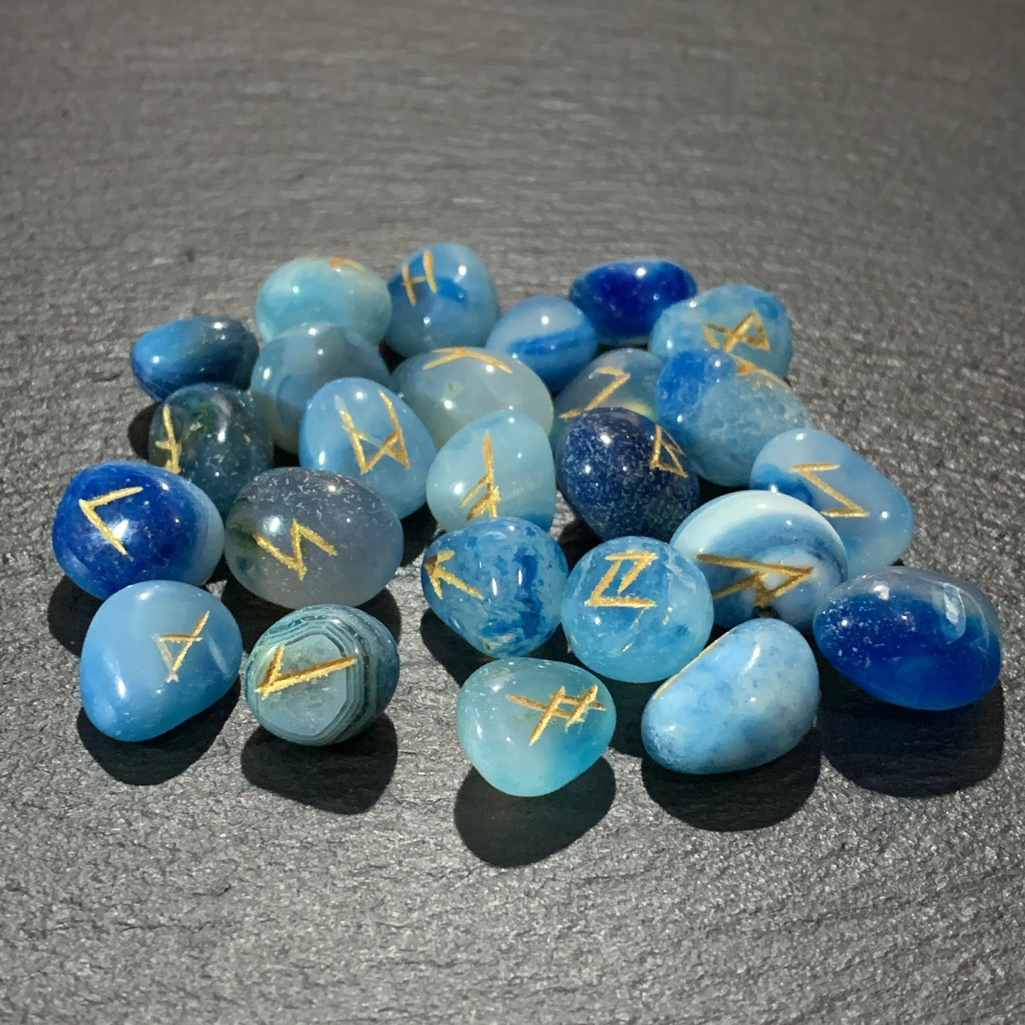 ブルーアゲート(青瑪瑙)に文字そのものに魔術効果のあるルーン文字を刻み込んだ石である。